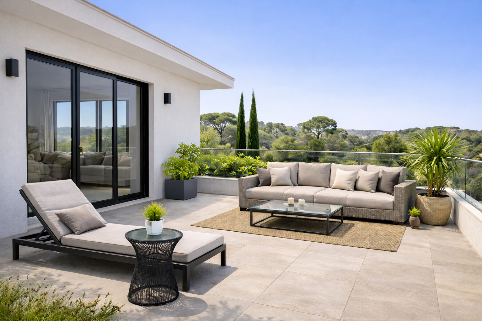 Il s’ouvre sur une terrasse plein ciel de 26 m², exposée plein sud, sans vis-à-vis, offrant des vues dégagées et une luminosité constante.