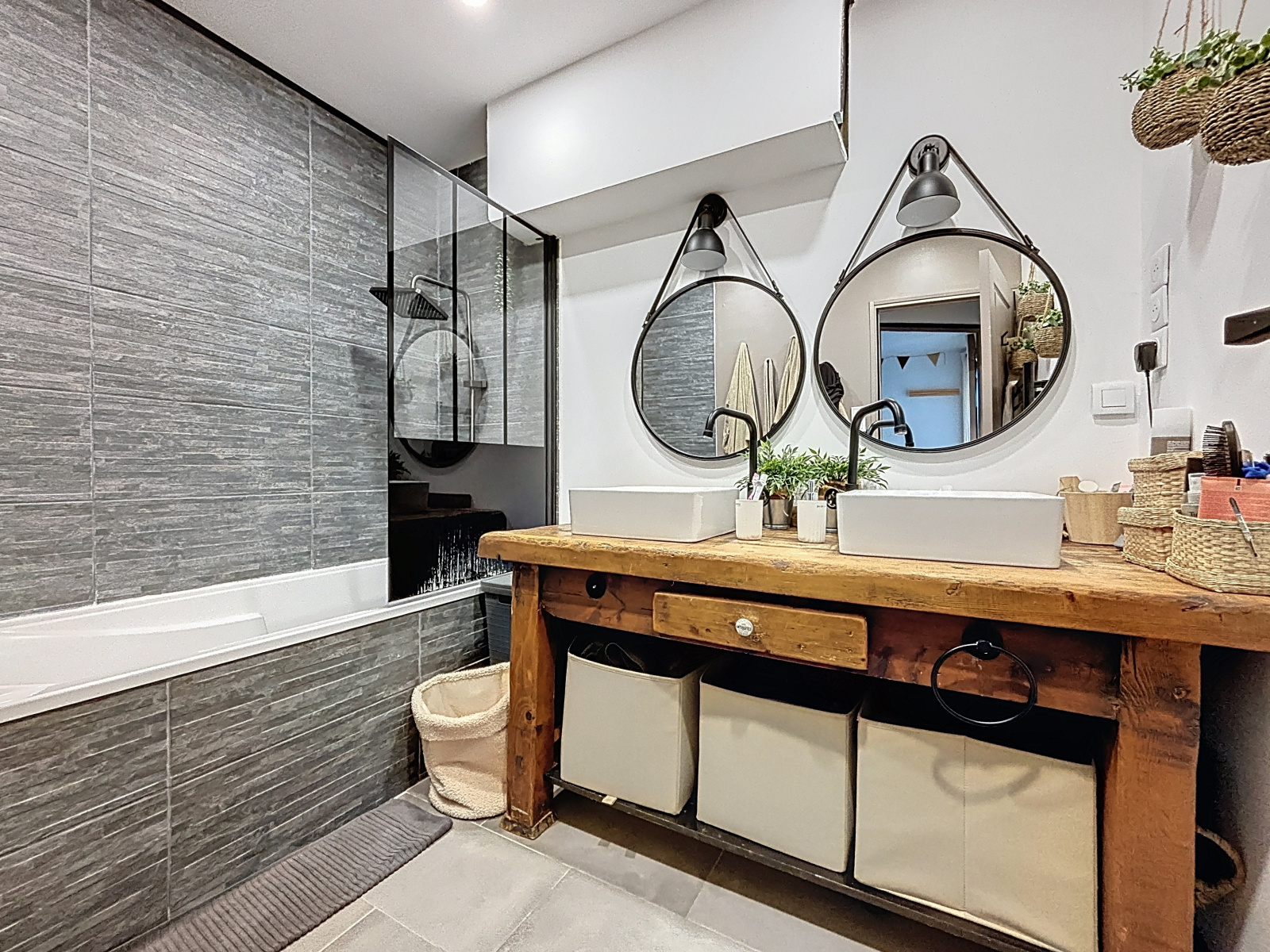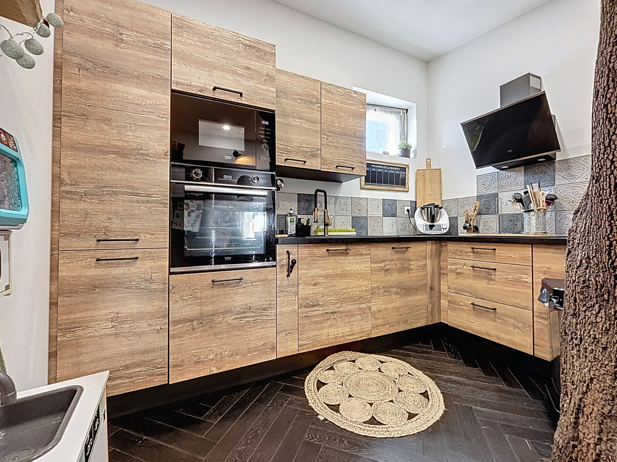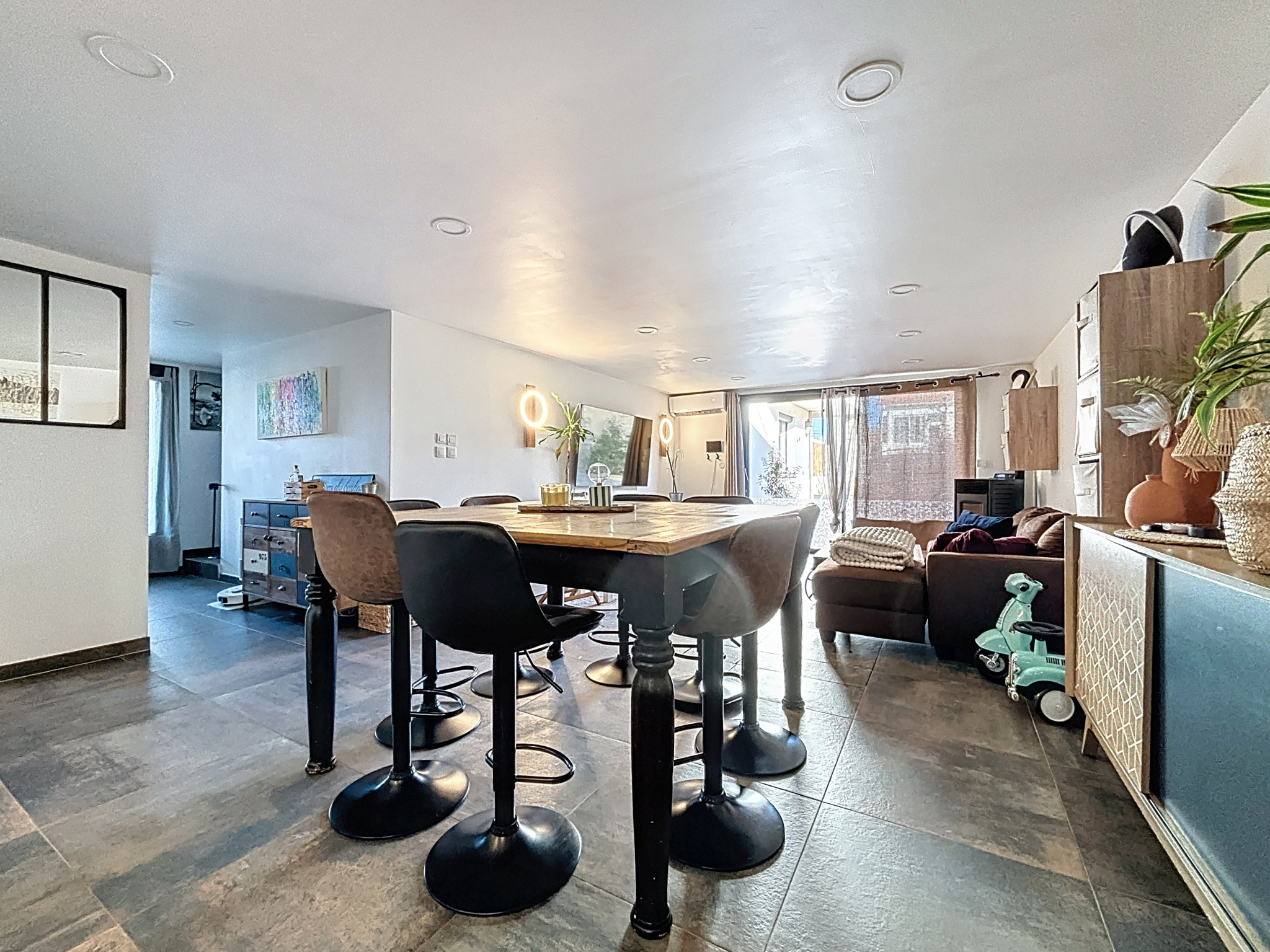 Cuisine entièrement équipée ouverte sur le séjour d'env. 39 m² avec son poêle à granulés et son accès cave, un couloir qui dessert 2 chambres dont une avec placards et dressing, un WC suspendu et une salle de bains avec baignoire, meuble double vasque, sèche-serviettes ainsi qu'un coin buanderie.