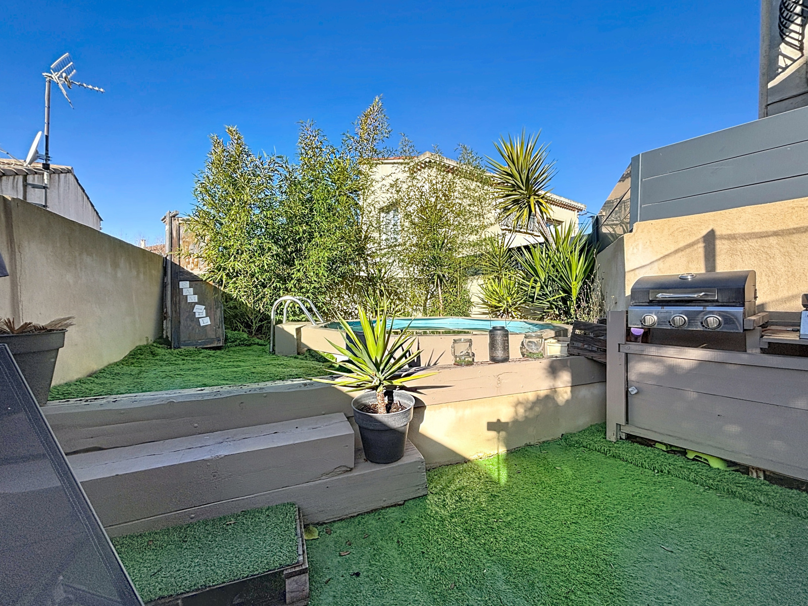 2 jardins dont un exposé sud-ouest avec une piscine semi-enterrée et une terrasse carrelée.